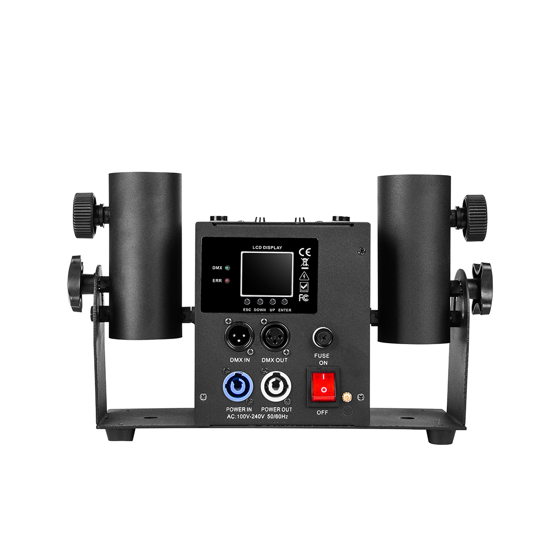 • Spray height: 6-12 meters • Set-Up: – • Voltage: AC110V -220V, 60Hz /50Hz • Max Power: 60W • Control: DMX 512/Remote • DMX Channel: 4 • Confetti Load: Cartridge x 2 • N.W.: 3.0KG • G.W.: 3.5KG • Product Size: 36x12x22cm • Packing Size (Carton): 38x17x24.5cm • Component: Power Cord, DMX Cord • Packing Option: Normal Carton, Flycase (extra charge)