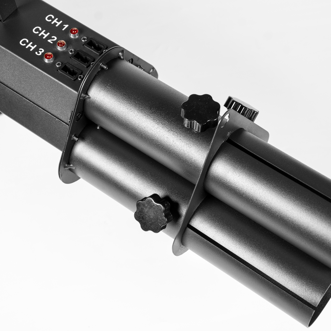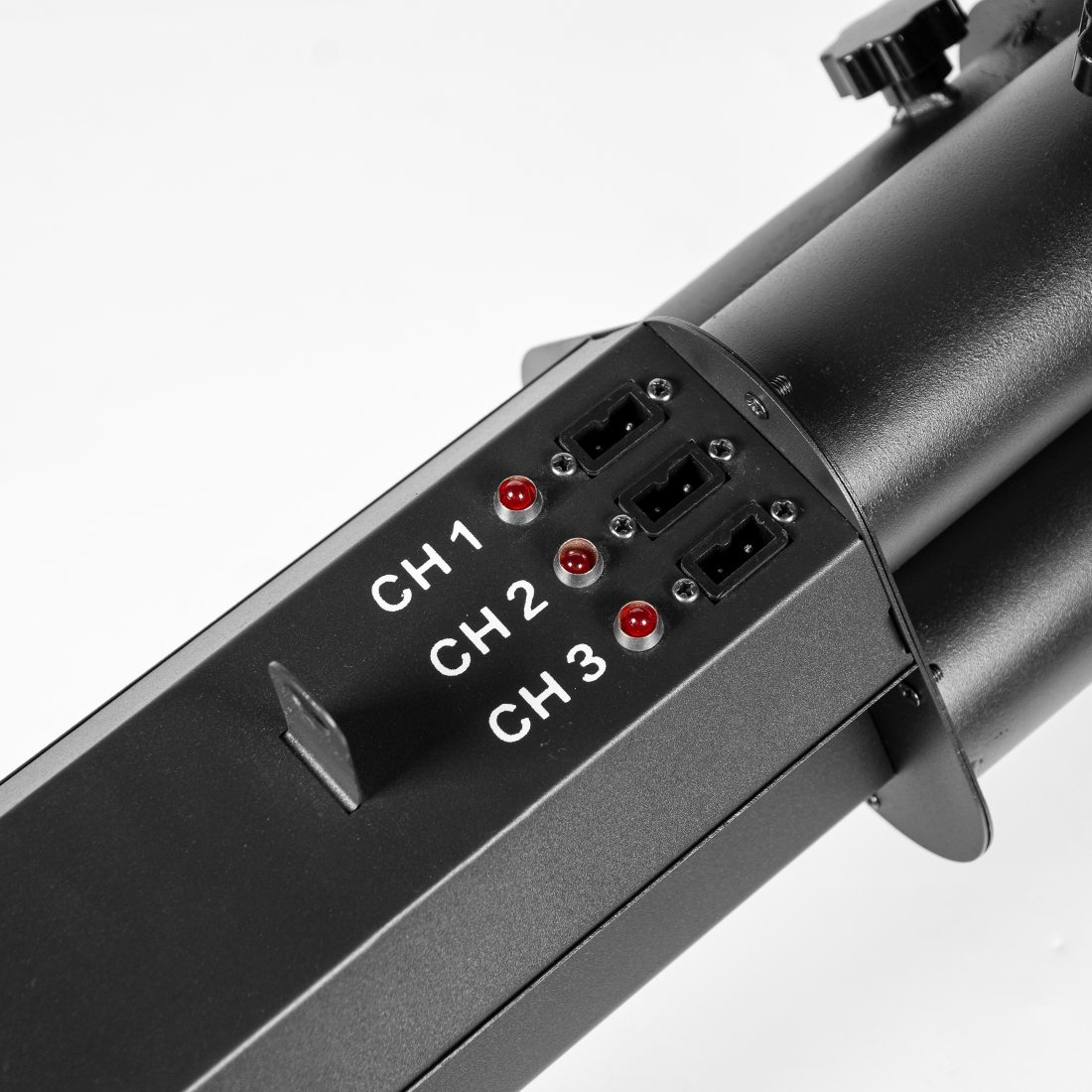 • Spray height: 8-10 meters • Set-Up: – • Voltage: DC12V • Max Power: 20W • Control: Manual • DMX Channel: – • Confetti Load: 3 Cartridges • N.W.: 2.5KG • G.W.: 7.5KG • Product Size: 55 x 14 x 24cm • Packing Size (Carton): Size: 60 x 30 x 16cm • Component: Charger • Packing Option: Normal case