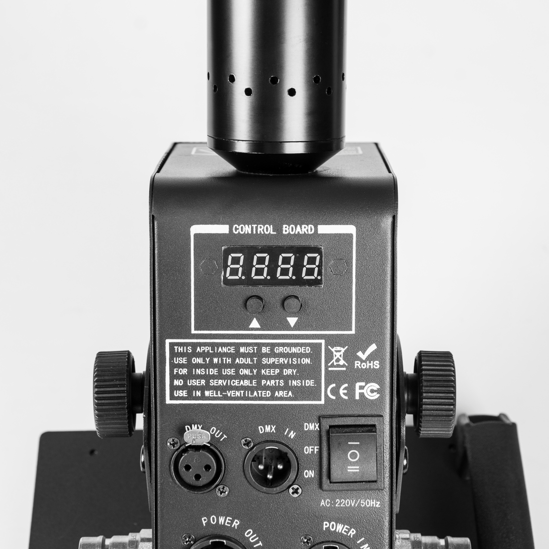 • Spray Height: 10-12 Meters • Angle: 0-90 degree adjustable • Voltage: 100V – 240 V / AC. 50/60 Hz • Max Power: 30W • Control: DMX512 • DMX Channel: 2 • Max Pressure: 1600 Psi • N.W.: 5.7KG • G.W.: 8.5KG • Product Size: 24.5 x 15 x 41cm • Packing Size (Carton): 32 x 27 x 47cm • Component: Power Cord, DMX Cord, Gas Cord • Packing Option: Normal Carton / Flycase (Separate Cost)