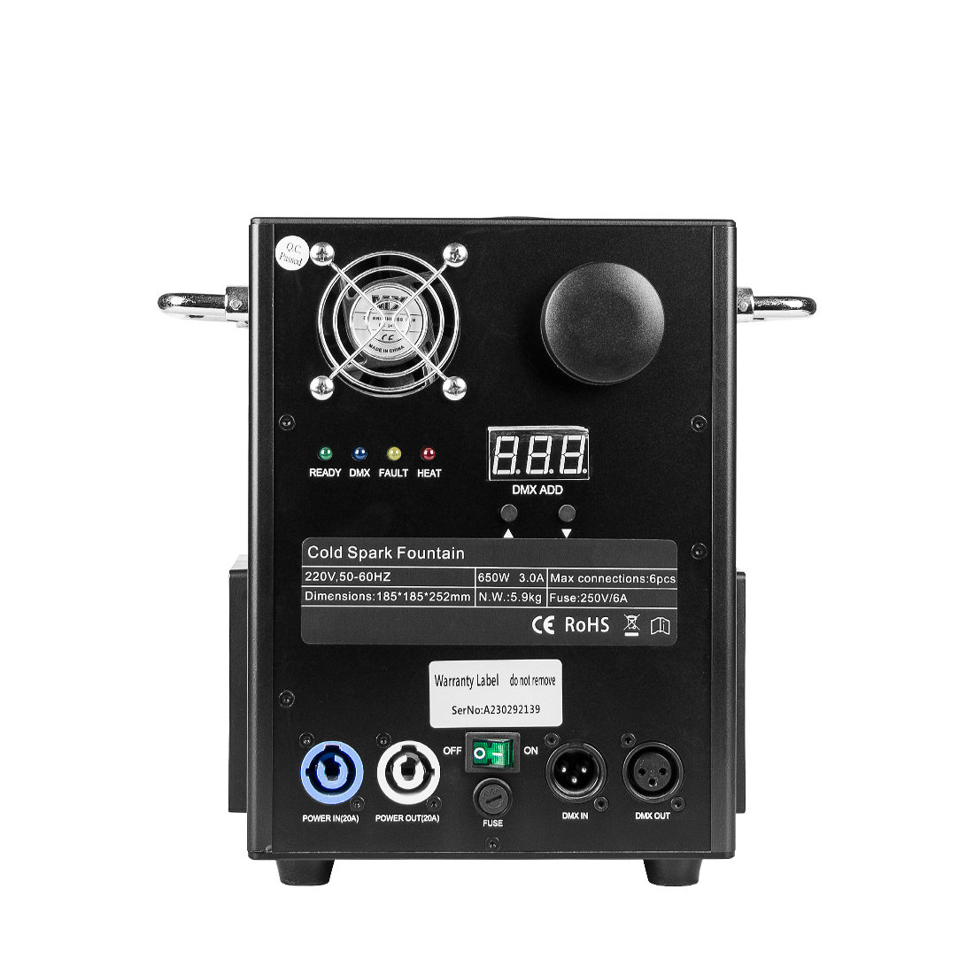 • Spark Height 1-5 Meters • Max Power 650W • Voltage AC110V / 220V, 50Hz / 60Hz • Spark Source Aluminum • Angle Up Straight • Control DMX 512 / Remote • DMX Channel 2 • N.W. 5.9KG • G.W. 7.2KG • Product Size 20.5×20.5×26.5cm • Packing Size (Carton) 29x29x30cm • Component Power Cord, DMX Cord • Packing Option Normal Carton