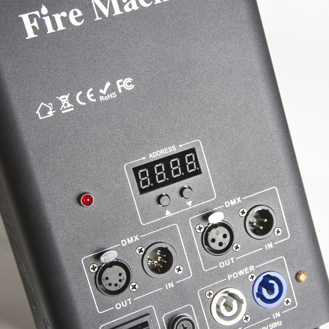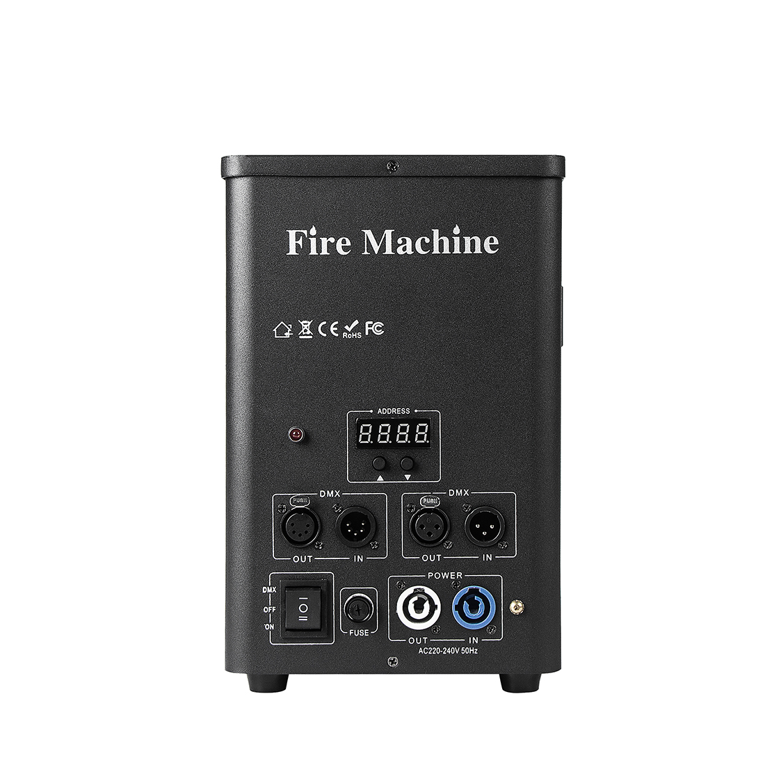• Fire Height: 1-3 Meters • Angle: Up straight only • Voltage: AC110V / 220V, 60Hz / 50Hz • Max Power: 80W • Control: DMX512 / Electric Control • DMX Channel: 2 • Fire Source: Fire Fluid • N.W.: 4.1KG • G.W.: 5.0KG • Product Size: 18.5×18.5x29cm • Packing Size (Carton): 25x25x33.5cm • Component: Power Cord, DMX Cord • Packing Option: Normal Carton