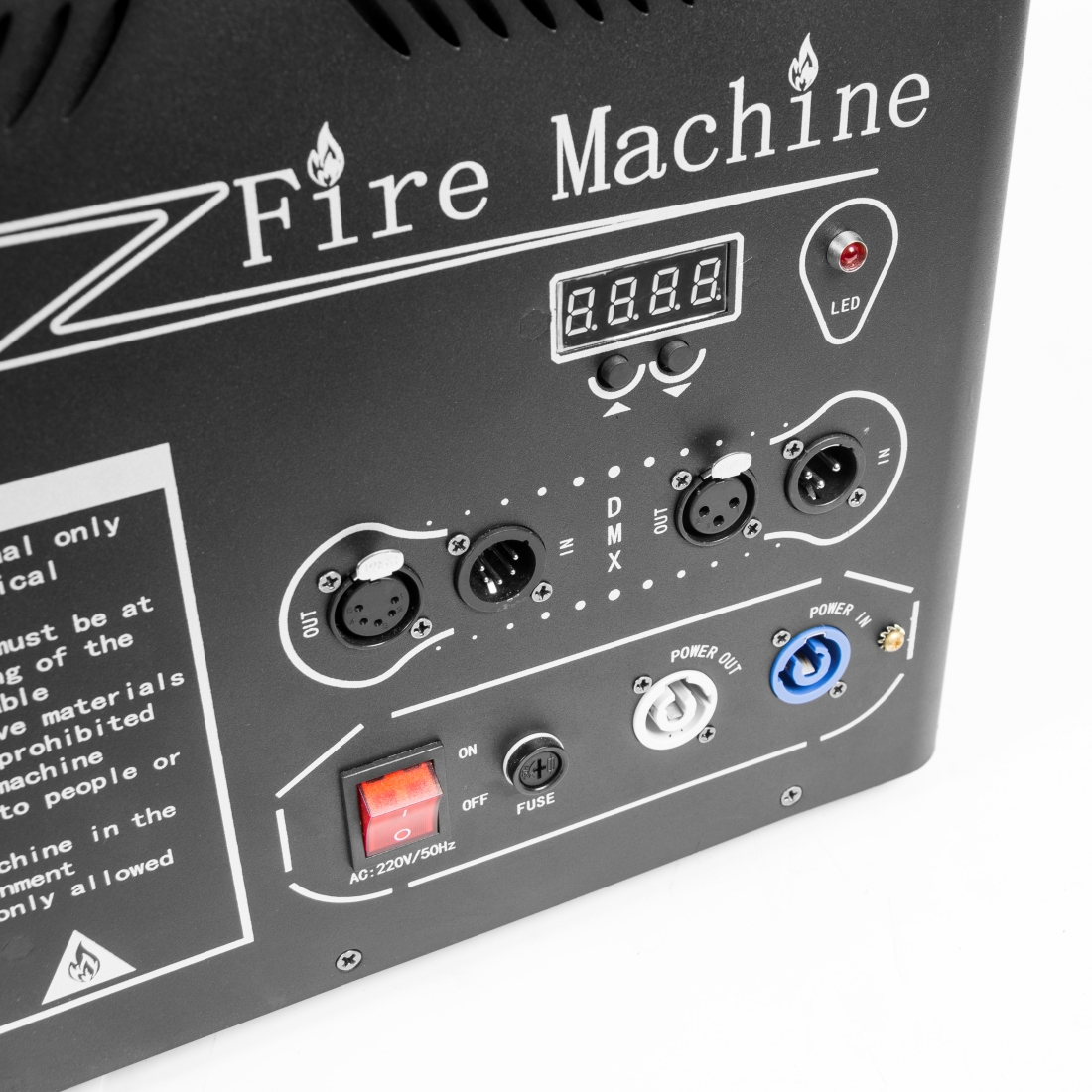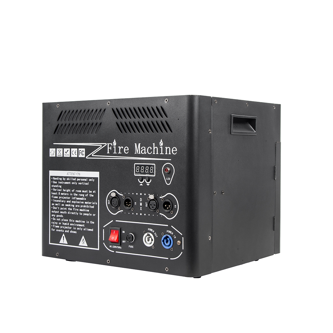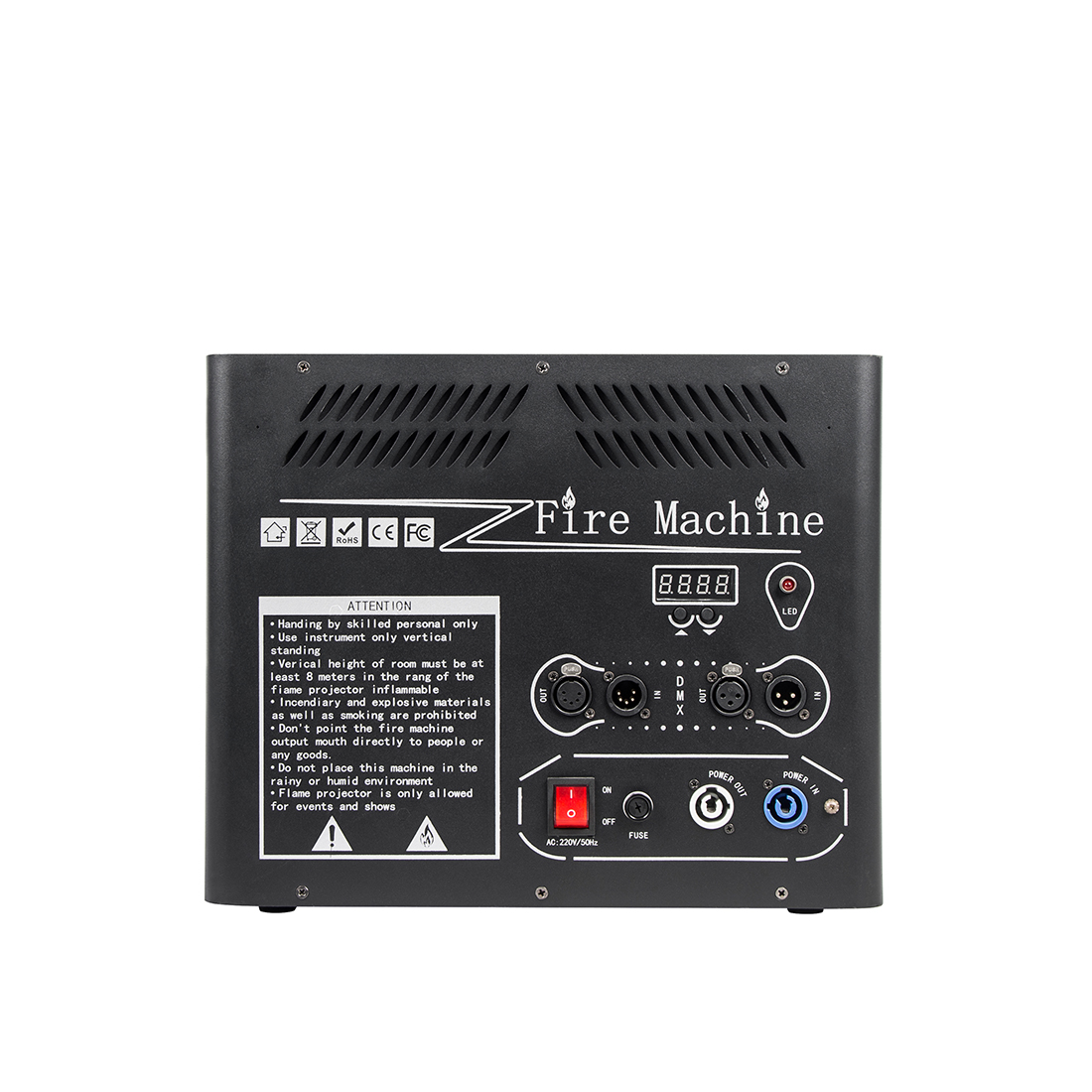 • Fire Height: 5-6 Meters • Fire Source: Butane fluid x 4 • Angle: Up Straight • Voltage: AC110V / 220V, 60Hz / 50Hz • Max Power: 180W • Control: DMX 512 • DMX Channel: 7 • N.W.: 11.6KG • G.W.: 13.1KG • Product Size: 38x31x33cm • Packing Size (Carton): 45x40x39cm • Component: Power Cord, DMX Cord • Packing Option: Normal Carton