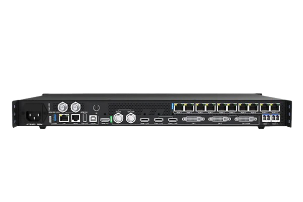 Input • Video input ports: - 1 × HDMI2.0 - 1 × HDMI1.4 (IN & LOOP) - 1 × DVI (IN & LOOP) - 1 × DVI - 1 × 3G-SDI (IN & LOOP) - 1 × 10G fiber port (Fiber1) • Supports up to 4096×2160@60Hz input. • Supports 8-bit/10-bit video signal. • HDMI2.0 port supports HDCP2.2 and is compatible with HDCP1.4 standards. • HDMI1.4 and DVI ports support HDCP1.4 standard. • Frame rate: 23.98Hz to 240Hz. Output • 10 Gigabit network ports. - Maximum loading capacity: 3.93 million pixels, up to 16,384 pixels in width and 8,192 pixels in height. • 2 × 10G Gigabit fiber ports: - Fiber1 copies 10× Ethernet ports. - Fiber2 copies/backups 10× Ethernet ports. • Fiber port supports video loop output. - Supports up to 14K1K@60Hz or 22K1K@60Hz video source. • 1 × HDMI1.3 for previewing or video output. • Frame rate: 23.98Hz to 240Hz. • Supports both Ethernet port backup and controller redundancy. Video Processing • Supports 8-bit and 10-bit video processing. • Video signal cropping, switching, and broadcasting-level scaling. • Supports 3× layers display with independent adjustment of size and position. • No latency in bypass mode. • Supports HDR display. • Supports Genlock and LOOP through. Color Adjustment • Image adjustment: Hue, saturation, contrast, and brightness compensation of output. • Brightness adjustment: By Ethernet port groups. • Color temperature adjustment: Precise color temperature and individual RGB component adjustment. Audio Input/Output • HDMI port supports audio input. • Supports audio output via multi-function card. 3 Working Modes • Video processor • Fiber optic transceiver • Bypass Device Control • USB port for control and cascading. • RS232 serial communication protocol. • LAN port for TCP/IP control.