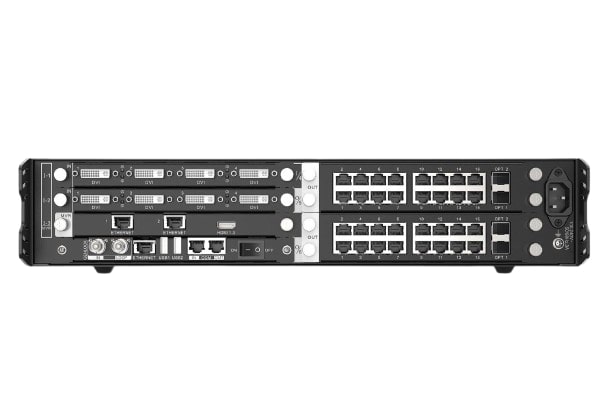 Hardware Features: • Two different types of 4K Sending Cards available: H_20xRJ45: Manages up to 13 million pixels. H_16xRJ45: Manages up to 10.4 million pixels (including 2x OPT-Out). • Different configurations possible on one Sending Card: 4x 2K × 1K@60 Hz. 2x 4K × 1K@60 Hz. 1x 4K × 2K@60 Hz. • Online monitoring for all input and output cards. • "Hot-Swap" function for all input and output cards. • IP input card H_2xRJ45 supports up to 100 IP cameras, including input mosaic. • Automatic decryption of HDCP-protected sources. • Multi-screen management. • Web control. Specifications: • Maximum number of input cards: 4. • Maximum number of input channels: 16. • Maximum number of output cards: 2. • Maximum loading capacity: 26,000,000 pixels. • Maximum number of layers: 32. General Specifications: • Supply voltage: AC 100 - 240V, 50/60 Hz. • Power consumption: 210 watts. • Dimensions: 482.6 × 88.1 × 455 mm (W × D × H). • Weight: 15.6 kg.