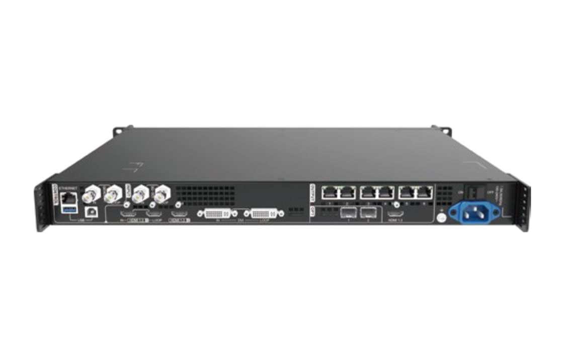 Hardware Features: Inputs: • 2x HDMI 1.3 (HDMI-In & Loop) (max. 1920×1200@60Hz), Custom EDID’s possible • 1x DVI (max. 1920×1200@60Hz), Custom EDID’s possible • 1x 3G-SDI (max. 1920×1080@60Hz) Outputs: • 6x LED-Out (RJ45) • 1x HDMI 1.3 Out (fixed resolution of 1920×1080@60Hz when used as monitoring output) • 2x OPT-Out (10G) Other Features: • V-Can Support • Genlock • Supports up to 3 Layers • Storage for 10 Presets • Cascading possible via USB • Display configuration possible without a computer • Control via USB or LAN General Specifications: • Supply voltage: AC 100-240V, 50/60Hz • Dimensions: 483.6 × 351.2 × 50.1 mm (W × D × H) • Power consumption: 28 Watts • Weight: 4 kg